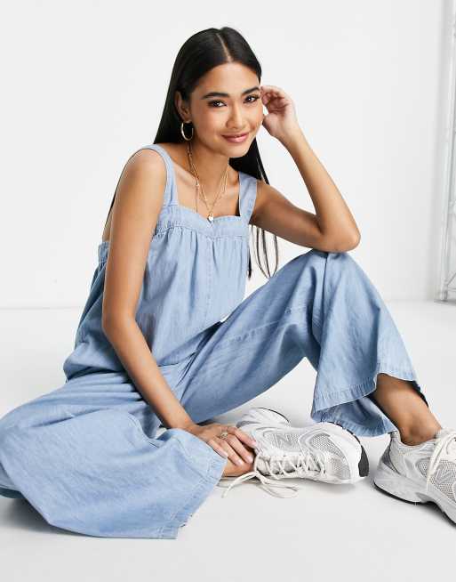 ASOS DESIGN – Weicher, gesmokter Jeans-Jumpsuit in heller Waschung