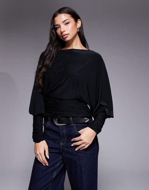ASOS DESIGN – Weiches, drapiertes Oberteil in Schwarz mit Fledermausärmeln und geraffter Taille