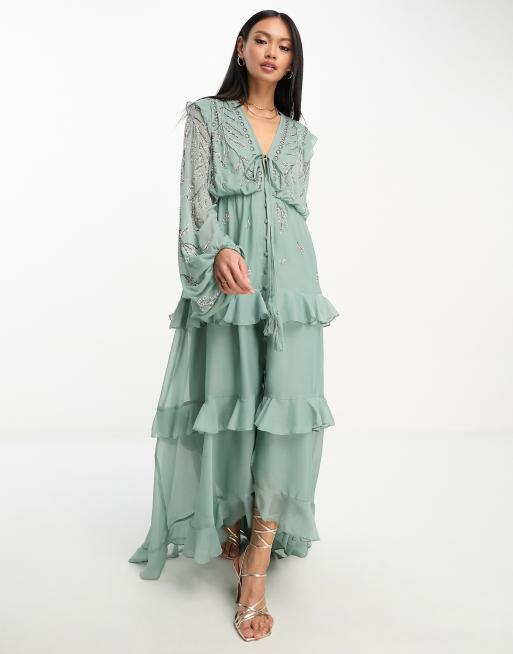 ASOS DESIGN – Weiches Midikleid in Salbeigrün mit Knopfleiste vorne und längs verlaufender Blumenverzierung