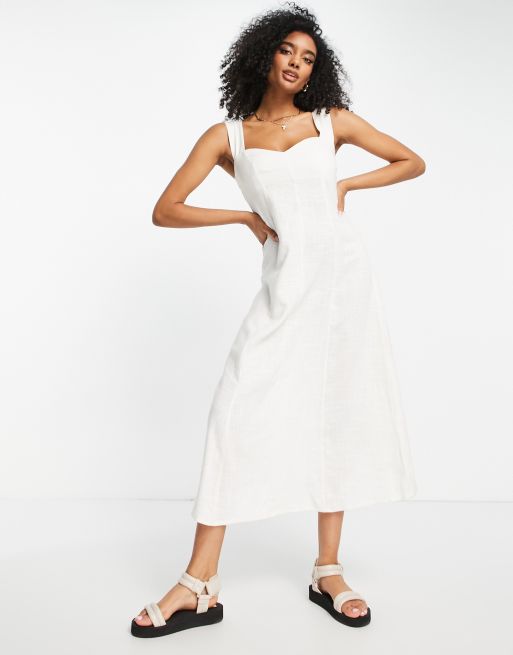 ASOS DESIGN – Weißes Midi-Sommerkleid aus Leinen mit gerafftem Rückendetail und herzförmigem Ausschnitt