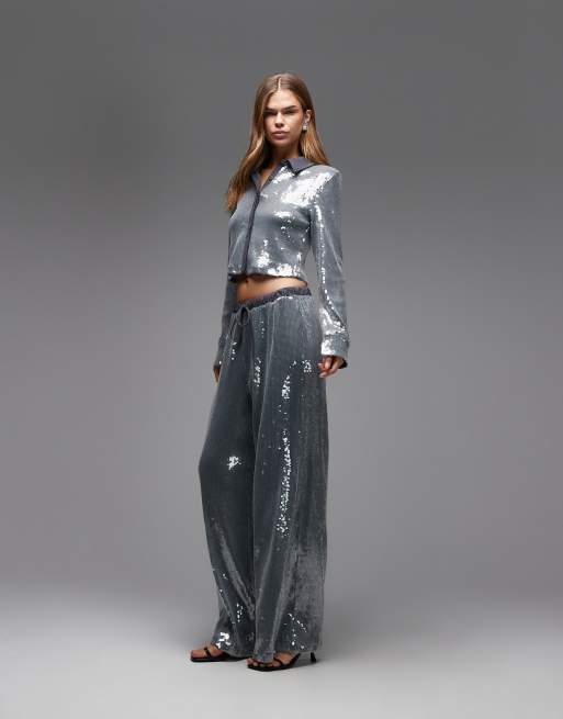ASOS DESIGN – Weit geschnittene Hose in Grau mit Kordelzugbund und Glaspailletten, Kombiteil