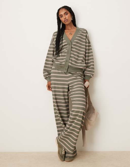 ASOS DESIGN – Weit geschnittene Jogginghose aus Loopback-Stoff in gestreiftem Olivgrün, Kombiteil