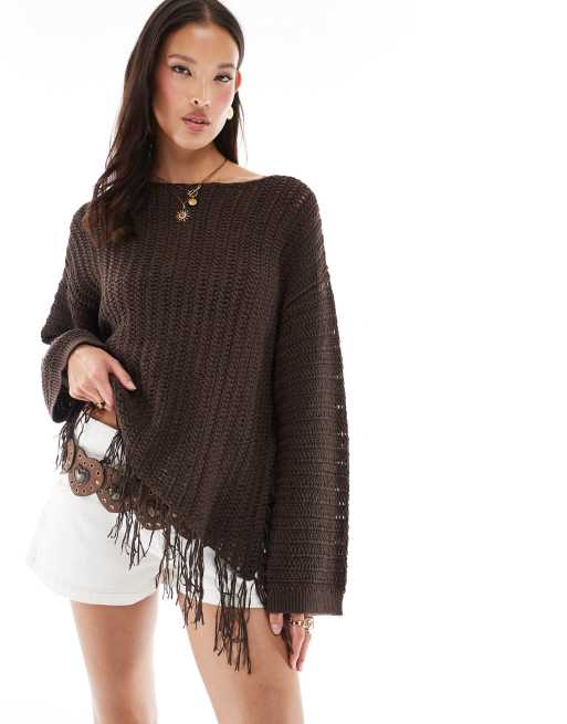 ASOS DESIGN – Weiter Pullover aus Häkelstrick in Schokobraun mit One-Shoulder-Design und Fransen