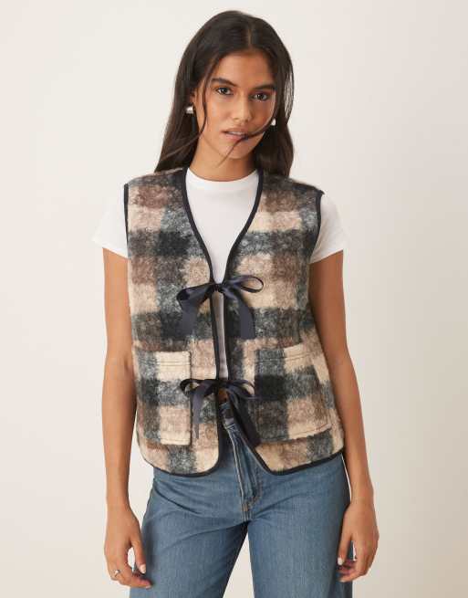 ASOS DESIGN – Weste aus Teddyfleece mit Karomuster und Schleifen