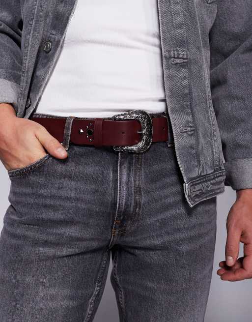 ASOS DESIGN – Western-Gürtel im Cowboy-Stil aus Kunstleder in Burgunderrot mit schwarzen Strassnieten