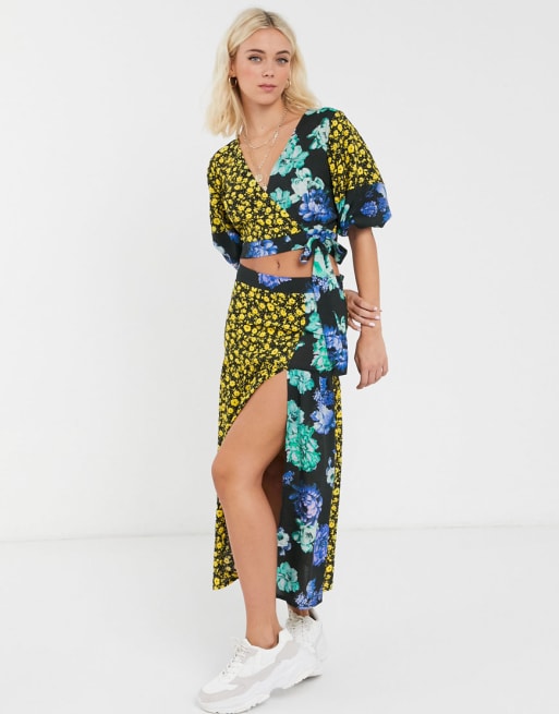 ASOS DESIGN – Wickel-Oberteil und Midirock mit verschiedenen Prints, Kombiteil