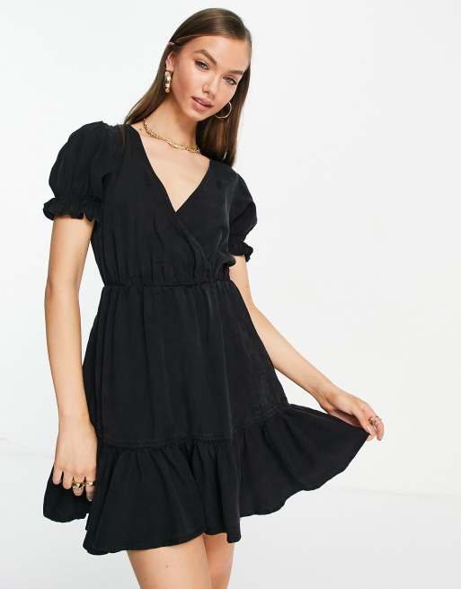 ASOS DESIGN – Wickelkleid aus weichem Denim mit Biesen in Schwarz