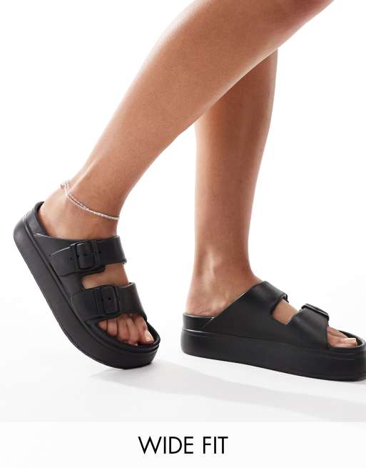 ASOS DESIGN Wide Fit – Freestyle – Sandalen in Schwarz mit flacher Plateausohle und zwei Schnallen, weite Passform