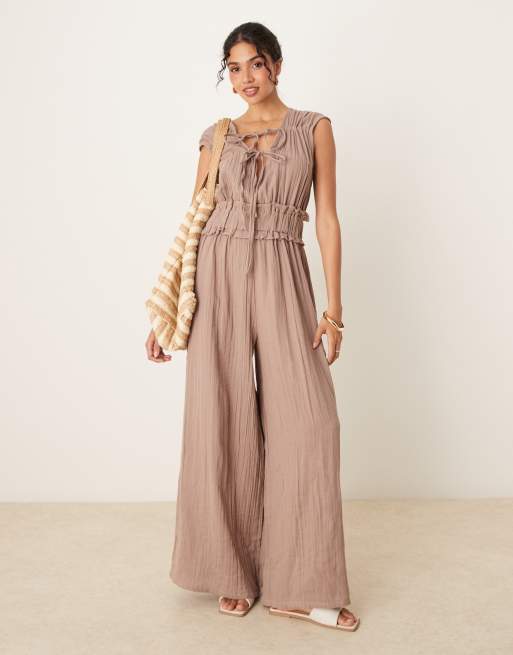 ASOS DESIGN – Zweilagiger Jumpsuit in Taupe mit geraffter Brustpartie