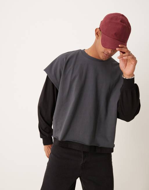 ASOS DESIGN – Zweilagiges, langärmliges T-Shirt in verwaschenem Schwarz mit kastigem Super-Oversize-Schnitt