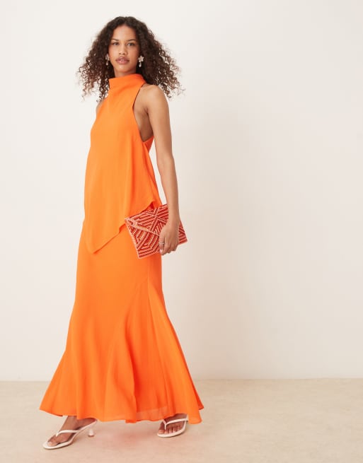 ASOS DESIGN – Zweilagiges Maxikleid aus Chiffon in Orange mit hohem Ausschnitt
