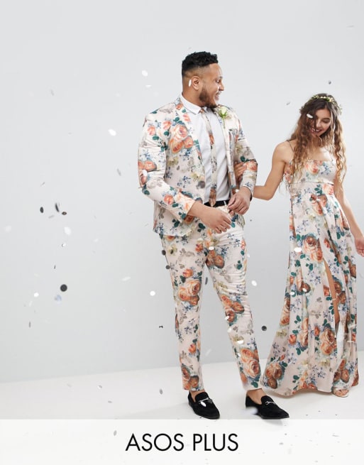 ASOS PLUS Wedding – Sehr enger Anzug mit geblümtem Print in Champagner