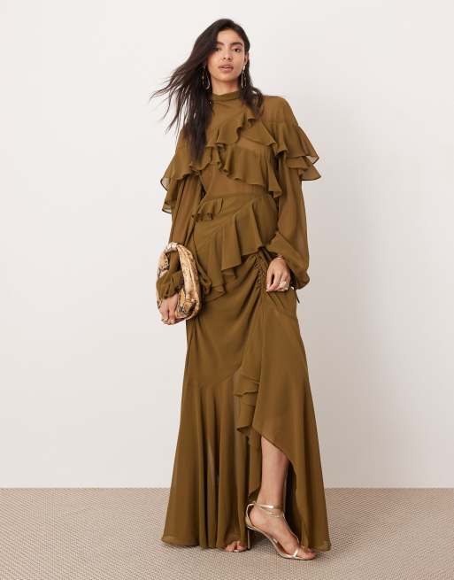 ASOS EDITION – Asymmetrisches Chiffon-Maxikleid in dunklem Olivgrün mit Rüschen