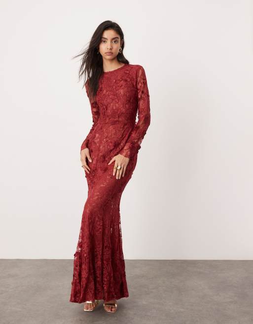 ASOS EDITION – Besticktes, langärmliges Maxikleid aus floraler Spitze in Burgunderrot mit Rückenausschnitt