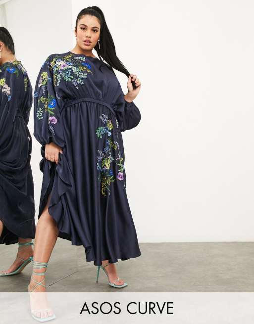 ASOS EDITION Curve – Besticktes, perlenbesetztes Midikleid in Marineblau