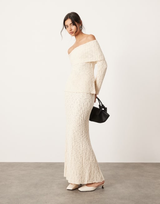 ASOS EDITION – Gestricktes, mehrlagiges Set in Cremeweiß aus langärmligem Oberteil mit Carmen-Ausschnitt und Maxirock