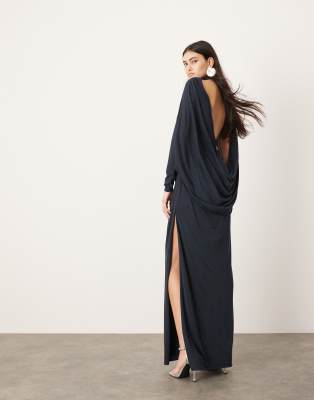 ASOS EDITION – Hochwertiges, hochgeschlossenes Maxikleid in Dunkelblau mit Wasserfallausschnitt hinten