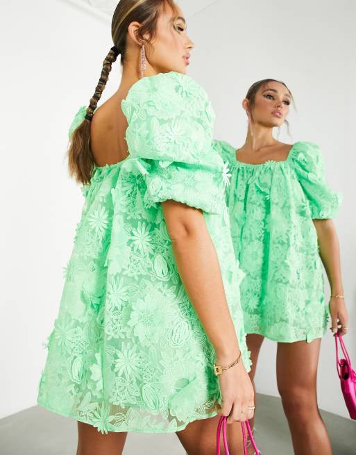 ASOS EDITION – Minikleid in leuchtendem Grün mit Puffärmeln und 3D-Blumenmuster