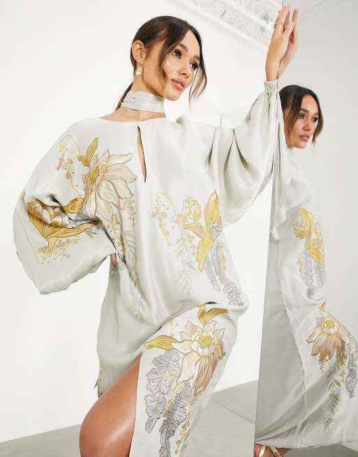 ASOS EDITION – Satinartiges Midikleid mit Blumenstickerei in Salbeigrün