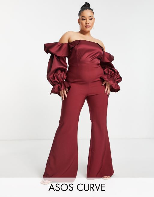 ASOS Luxe Curve – Bardot-Jumpsuit aus Satin in Weinrot