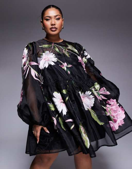 ASOS LUXE Curve – Kurzes Oversize-Hängerkleid aus Organza in Schwarz mit Blumenstickerei