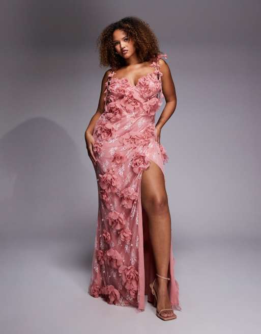 ASOS LUXE Curve – Maxikleid aus Spitze in Altrosa mit 3D-Blumenmuster