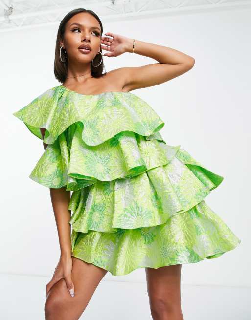 ASOS LUXE – Jacquard-Minikleid in Grün mit One-Shoulder-Träger und auffallenden Rüschen