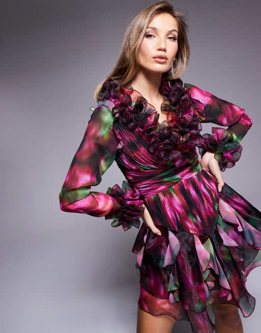 ASOS LUXE – Langärmliges Organza-Minikleid mit akzentuierten Rüschen und verschwommenem Blumenmuster