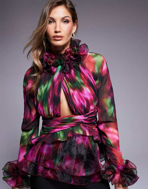 ASOS LUXE – Langärmliges Organza-Oberteil mit akzentuierten Rüschen und verschwommenem Blumenmuster