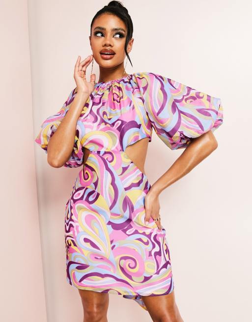 ASOS LUXE – Minikleid mit Puffärmeln, geschnürter Rückenpartie und 70er-Jahre-Muster