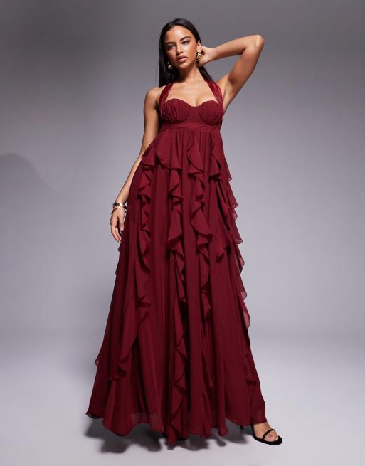 ASOS LUXE – Neckholder-Maxikleid in Beere mit Wasserfall-Rüschen