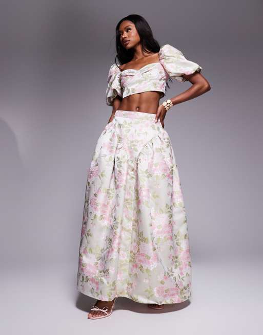 ASOS LUXE – Set aus Jacquard mit Tulpenmuster, aus Oberteil mit Puffärmeln und Maxirock mit Schleife auf der Rückseite