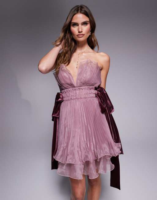 ASOS LUXE – Trägerloses, plissiertes Organza-Minikleid in Flieder mit gebundenen Schleifen