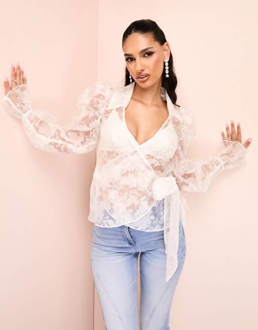 ASOS LUXE – Transparente Wickelbluse aus Organza in Weiß geblümt mit Bindedetail