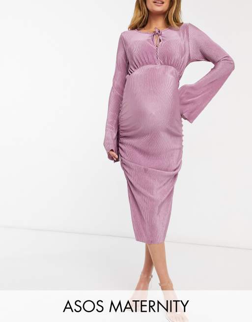 ASOS DESIGN Maternity – Baby Shower – Langärmliges, plissiertes Blouson-Midikleid mit Bindedetail und gerafften Seiten in Flieder