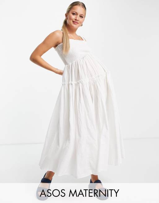 ASOS DESIGN Maternity – Gerafftes Camisole-Sommerkleid in Midilänge mit unversäubertem Saum in Weiß