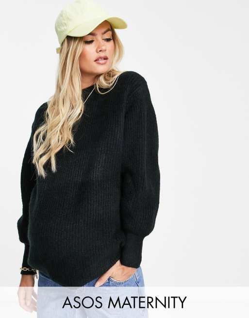 ASOS DESIGN Maternity – Gerippter Pullover aus flauschigem Garn mit Rundhalsausschnitt in Schwarz