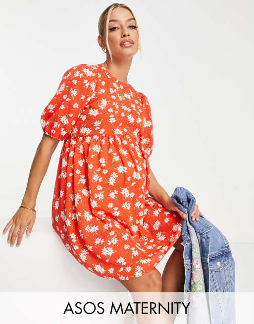 ASOS DESIGN Maternity – Kurzärmliges, gesmoktes Hänger-Minikleid mit Blumenmuster in Rot