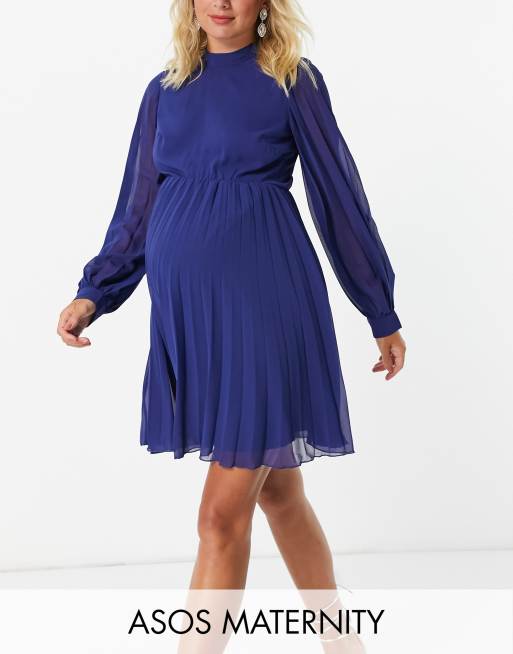 ASOS DESIGN Maternity – Kurzes, langärmliges Skater-Kleid mit hohem Halsausschnitt und Zierfalten in Marineblau