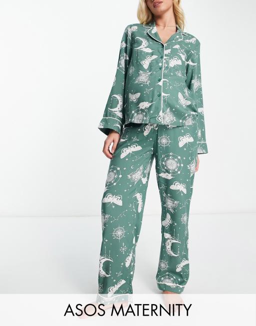 ASOS DESIGN Maternity – Modal-Pyjama aus Hemd und Hose in Salbeigrün mit Astrologie-Muster