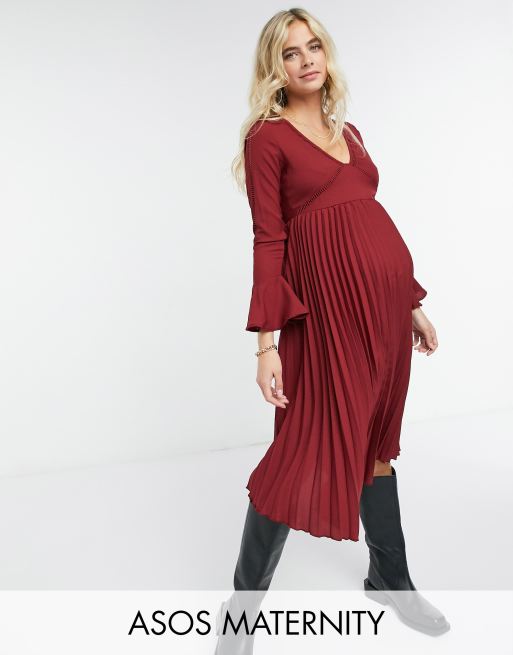 ASOS DESIGN Maternity – Plissiertes Midikleid mit Spitzeneinsätzen in Dunkelrot