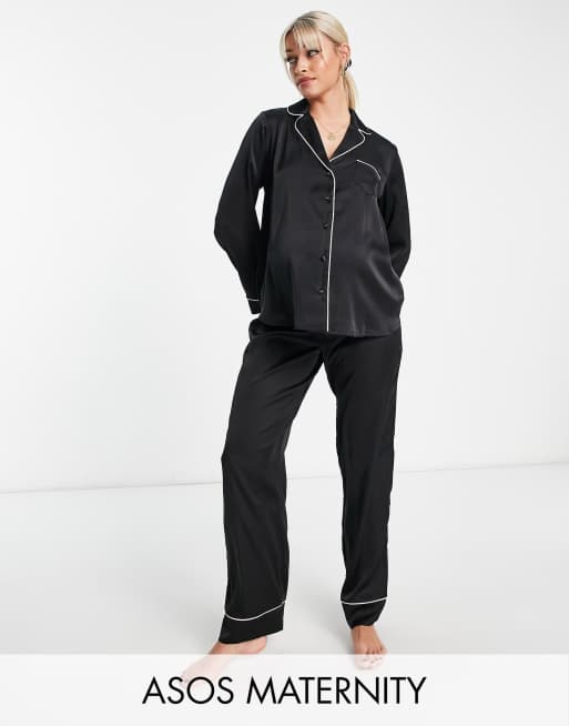 ASOS DESIGN Maternity – Satin-Pyjama mit langärmligem Hemd und Hose in Schwarz