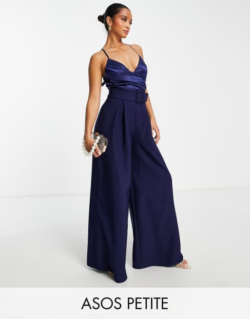 ASOS DESIGN Petite – 2-in-1-Jumpsuit in Marineblau mit Camisole aus Satin und weitem Bein