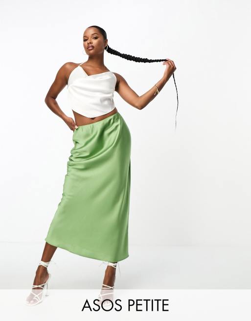 ASOS DESIGN Petite – Asymmetrischer Satin-Midirock in Khakigrün