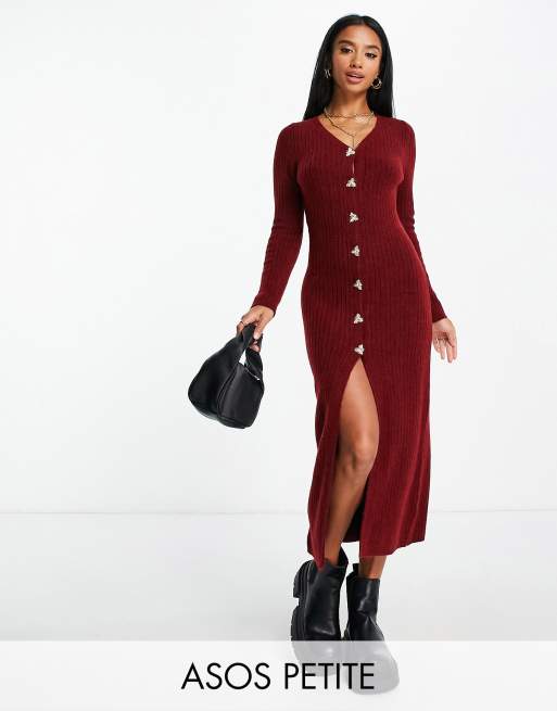 ASOS DESIGN Petite – Geripptes Maxi-Strickkleid in Dunkelrot mit durchgehender Knopfleiste