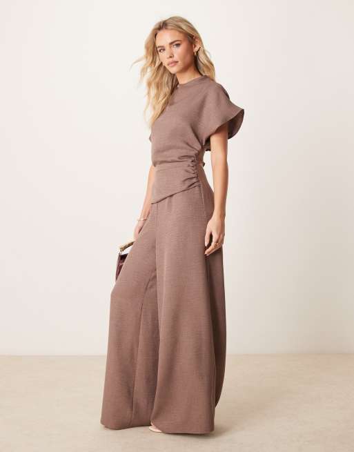 ASOS DESIGN Petite – Jumpsuit in mokkabrauner Leinenoptik mit Rückenausschnitt und gerafftem Detail