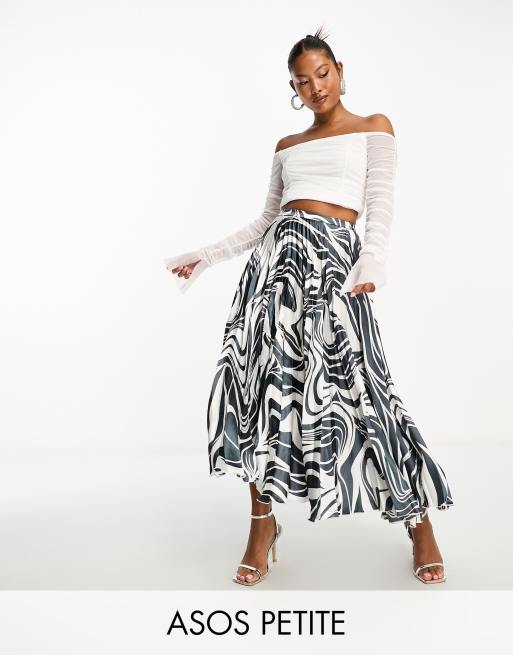 ASOS DESIGN Petite – Midi-Faltenrock aus Satin mit Zebramuster in Schwarz-Weiß