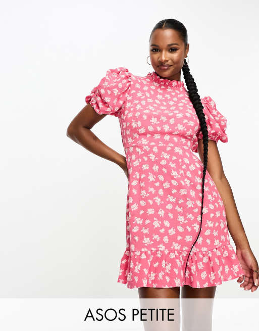 ASOS DESIGN Petite – Mini-Freizeitkleid in Rosa mit Blümchenmuster, gerüschtem Stehkragen und Puffärmeln