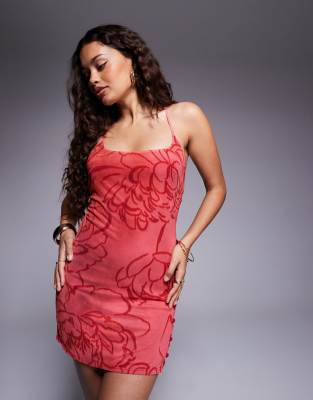 ASOS DESIGN Petite – Mini-Trägerkleid aus rosa Netzstoff mit Blumenmuster, eckigem Ausschnitt und Kontrastknöpfen