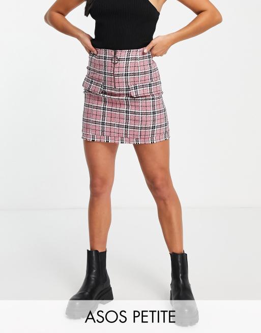 ASOS DESIGN Petite – Minirock aus Bouclé in Rosa kariert mit unversäubertem Saum und Taschendetail